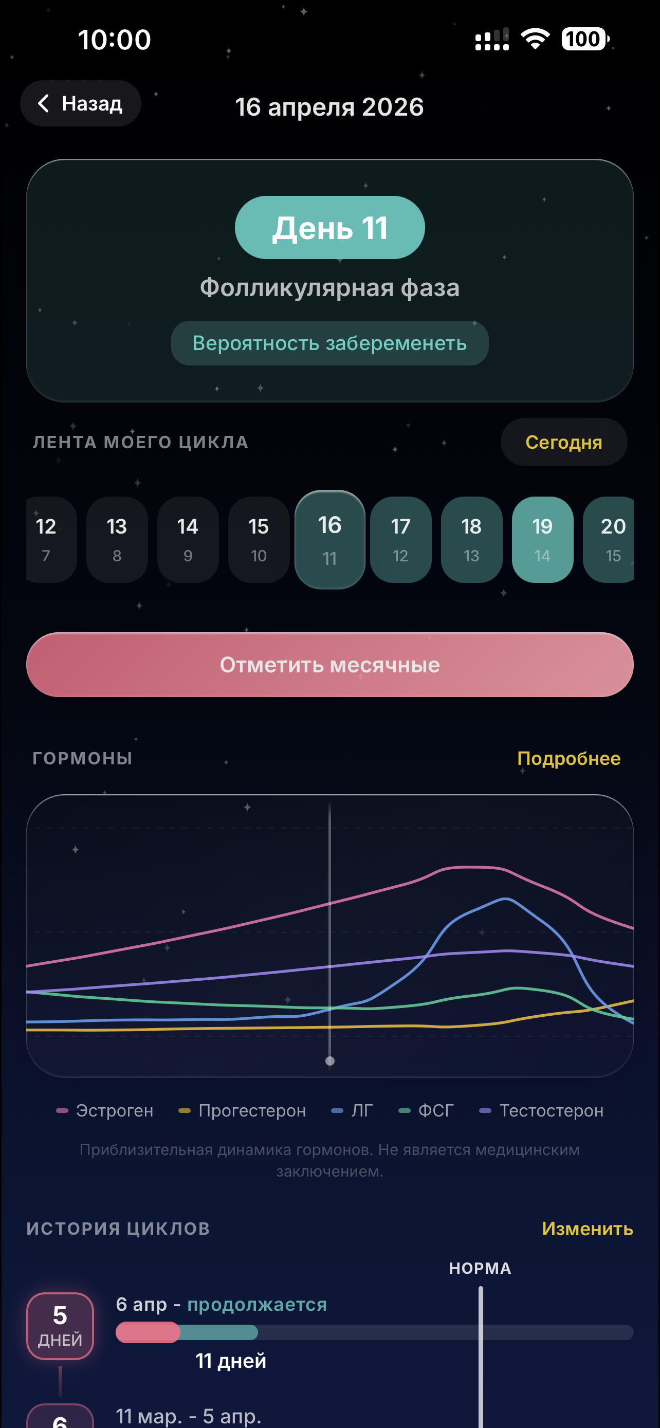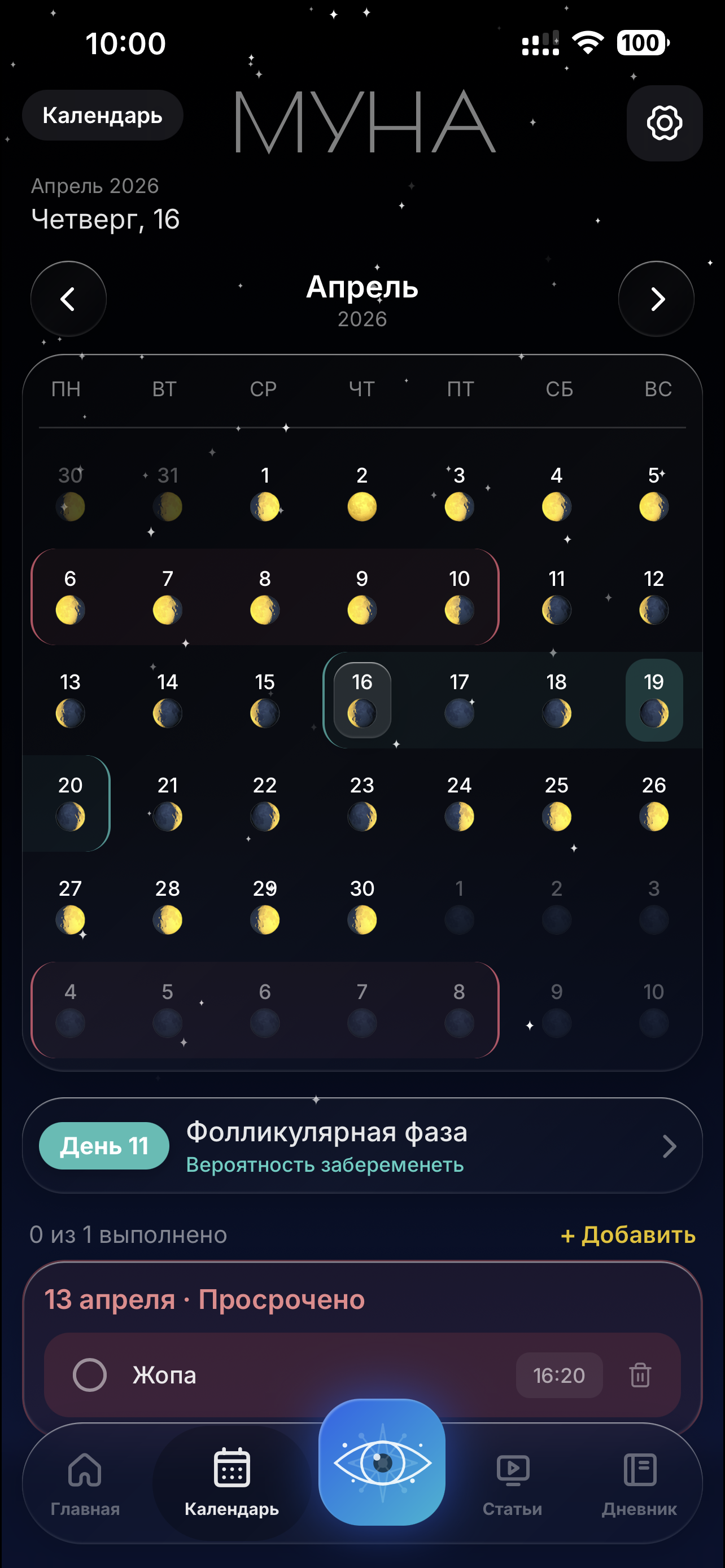 Отслеживание менструального цикла с прогнозами фертильности, привязанными к лунным фазам.