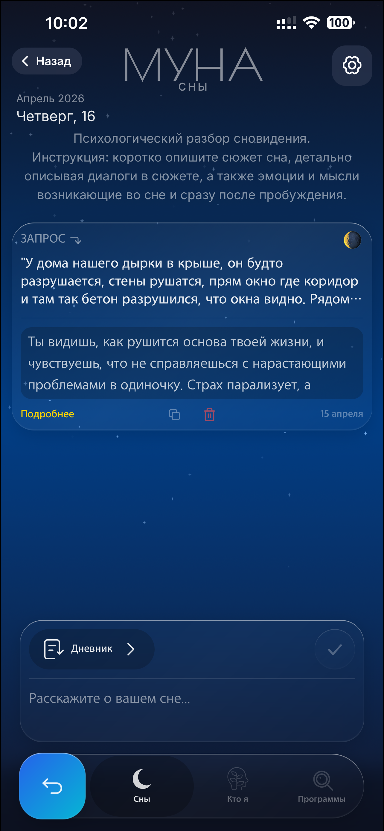 Данные, которые вы предоставляете: дата рождения, описания снов, записи в дневнике, задачи и напоминания, настройки.